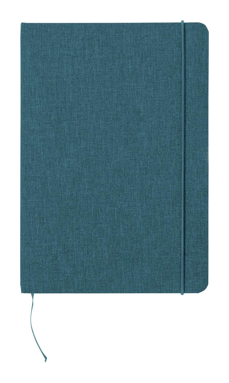 Quaderno formato A5 con 80 pagine bianche, copertina in poliestere 300D RPET, elastico colorato, segnalibro e porta penna.