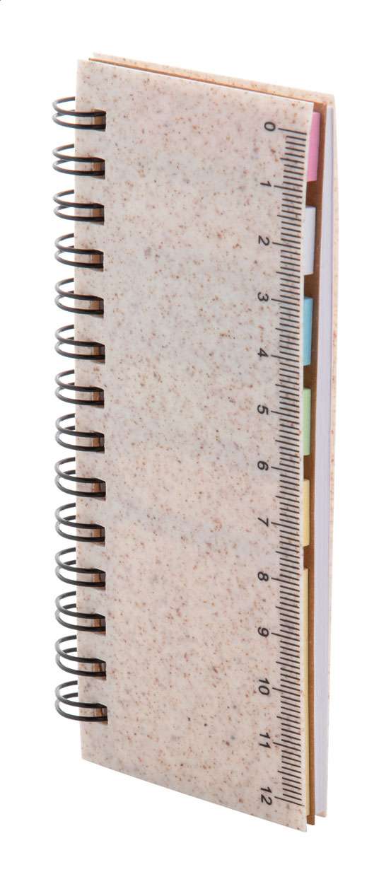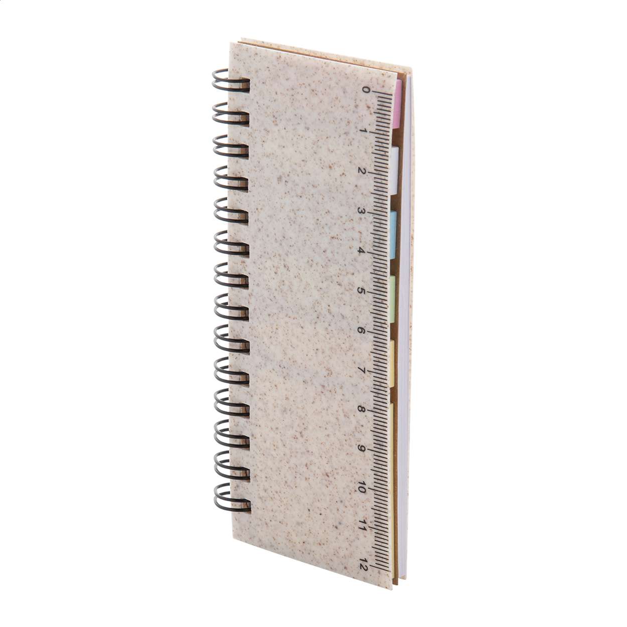 Quaderno a spirale con copertina in plastica ecologica in paglia di grano da 40 fogli in carta riciclata a righe, 25 foglietti adesivi e 125 segnapagina (in 5 colori diversi). Con righello da 12 cm sulla copertina.