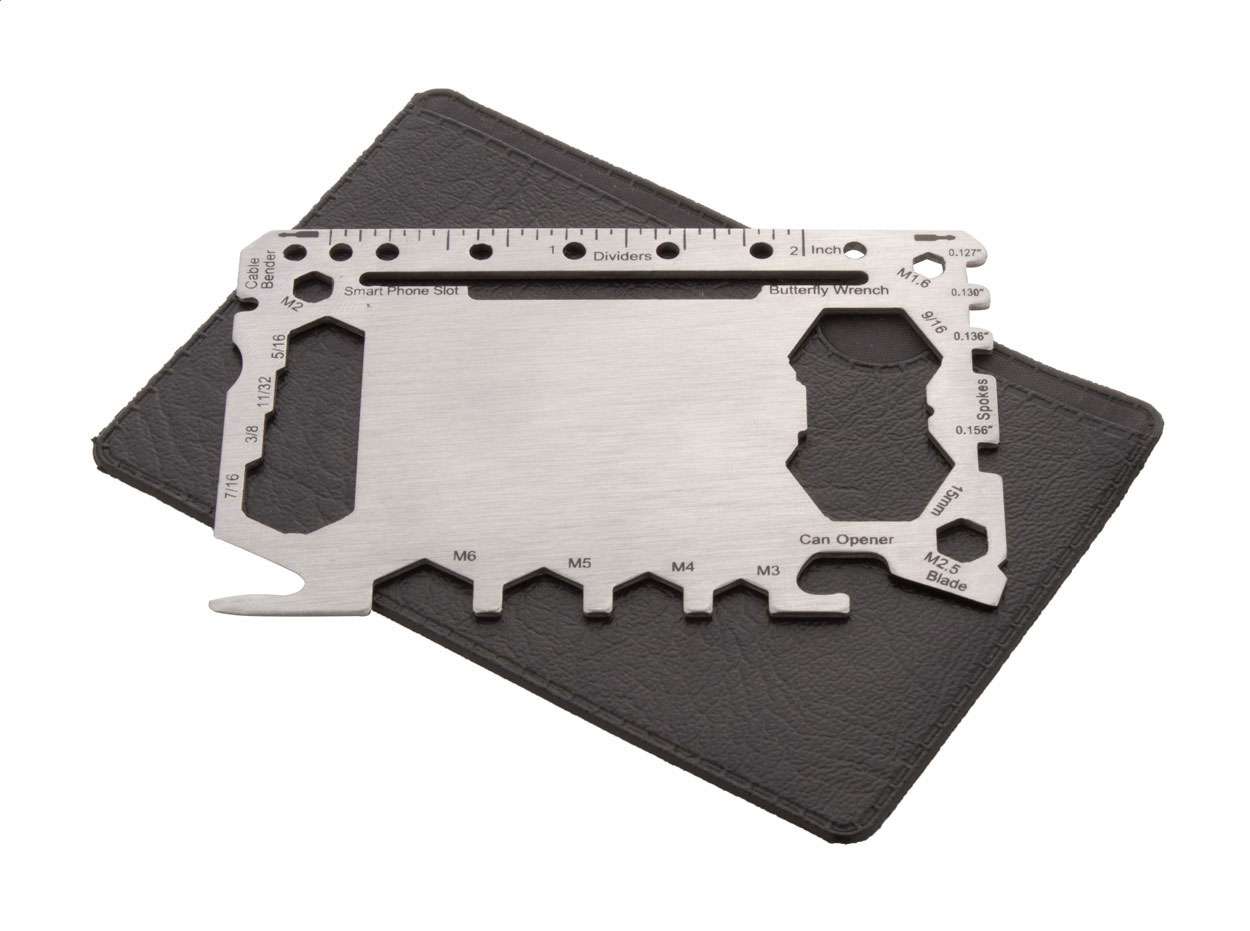 Multiutensile in acciaio a forma di carta di credito con 20 funzioni, in astuccio di pelle PU.