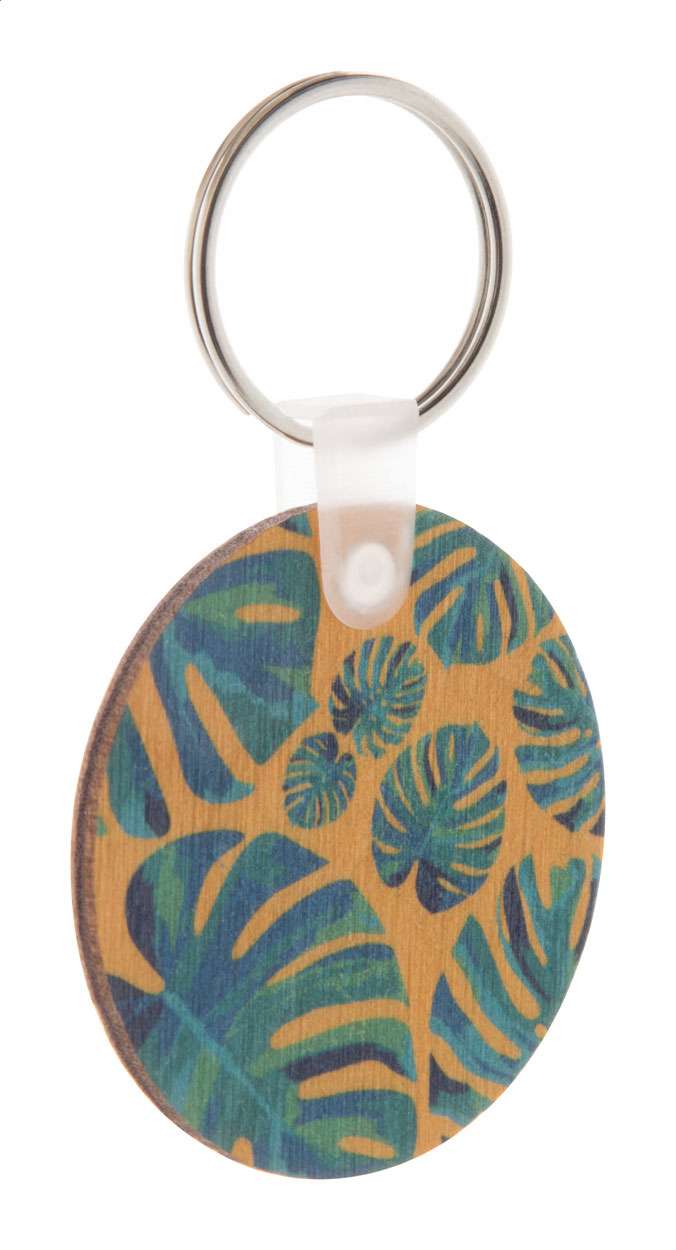 Portachiavi in legno di betulla laminato di forma rotonda con stampa a colori. Il prezzo include la stampa UV LED su un solo lato. Quantità minima: 200 pezzi.