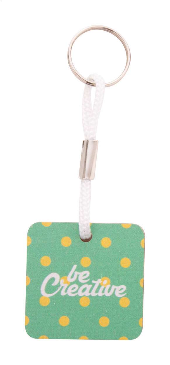 Portachiavi quadrato in compensato di betulla personalizzabile con stampa a colori e cordoncino in poliestere colorato. Il costo comprende la stampa UV LED su un lato. MOQ: 200 pz